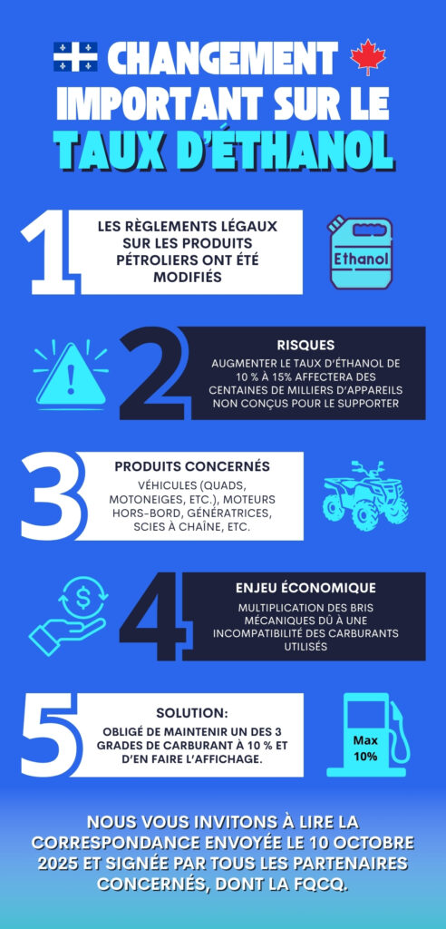 Dans une lettre envoyée au Ministère de l’Économie, de l’Innovation et de l’Énergie du Québec, le directeur général de l’Association des Concessionnaires de Véhicules de Loisirs du Québec (ACVLQ), M. Christian Caza, appuyé par la FQCQ et les autres fédérations de véhicules hors-route, a émis ses préoccupations en lien avec une hausse du taux d’éthanol contenu dans le carburant. Vous pouvez consulter la lettre originale envoyée au ministère en cliquant ici.